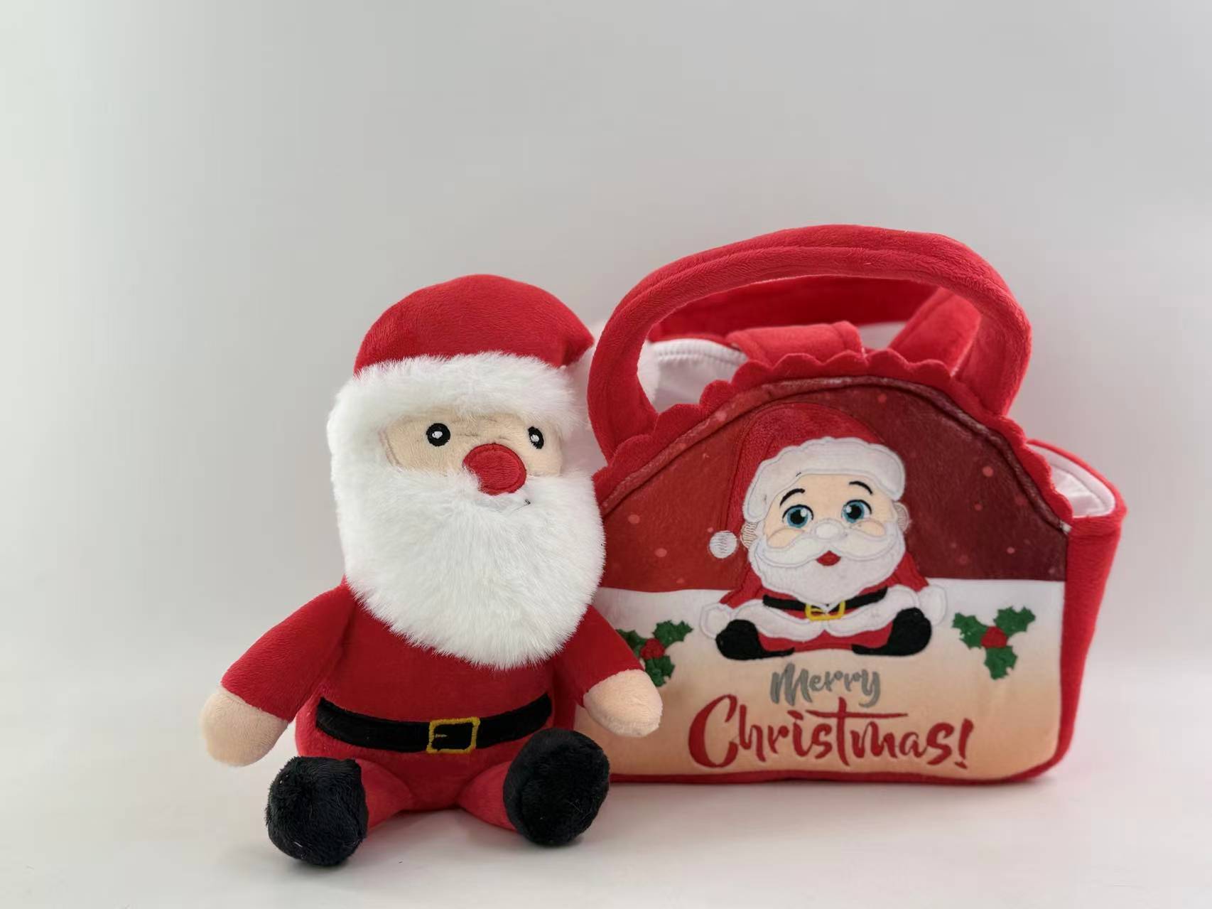 This Santa plush toy handbag combines a festive Santa Claus plush toy with a matching carry handle, making it perfect for Christmas gifts.